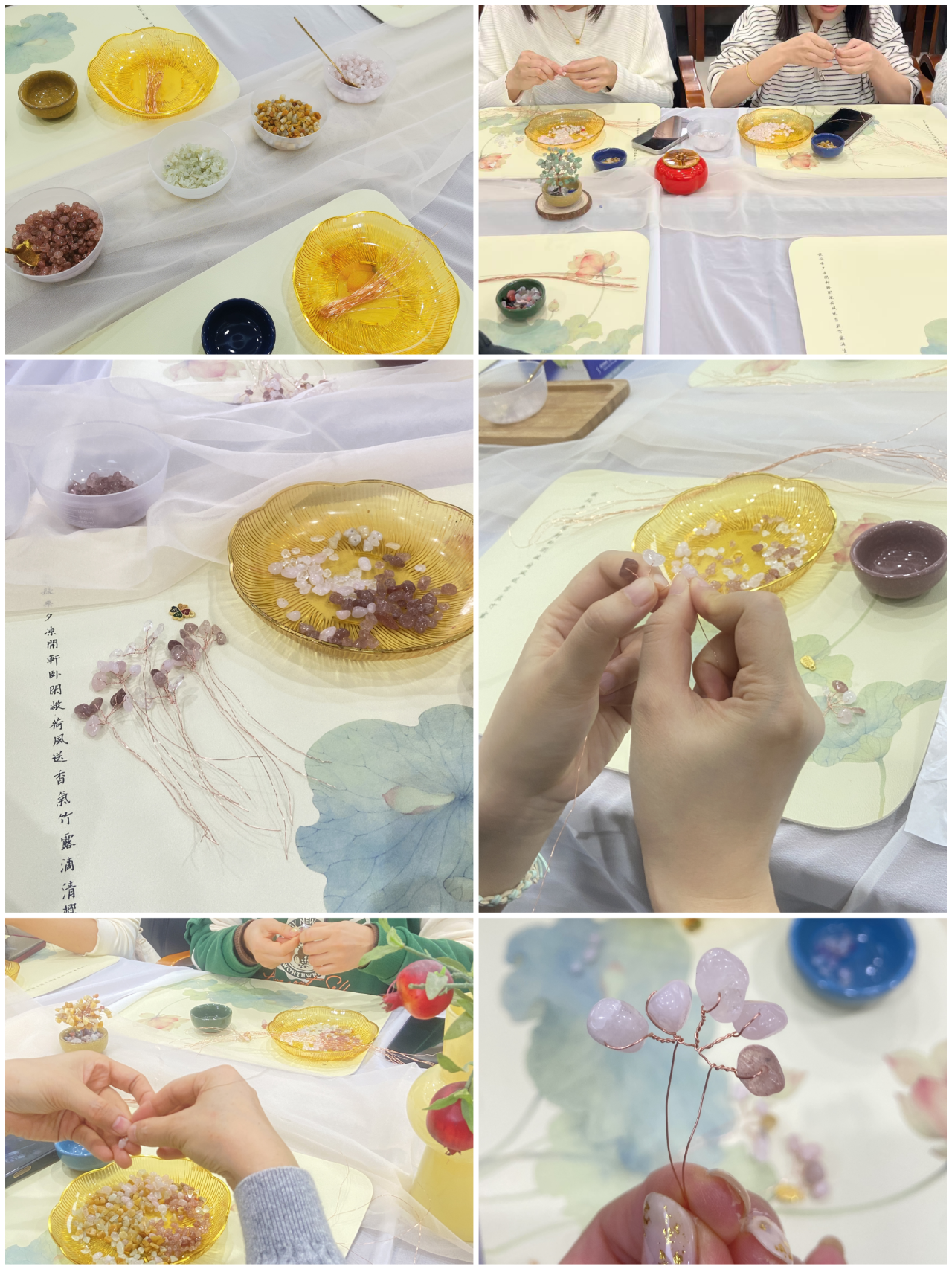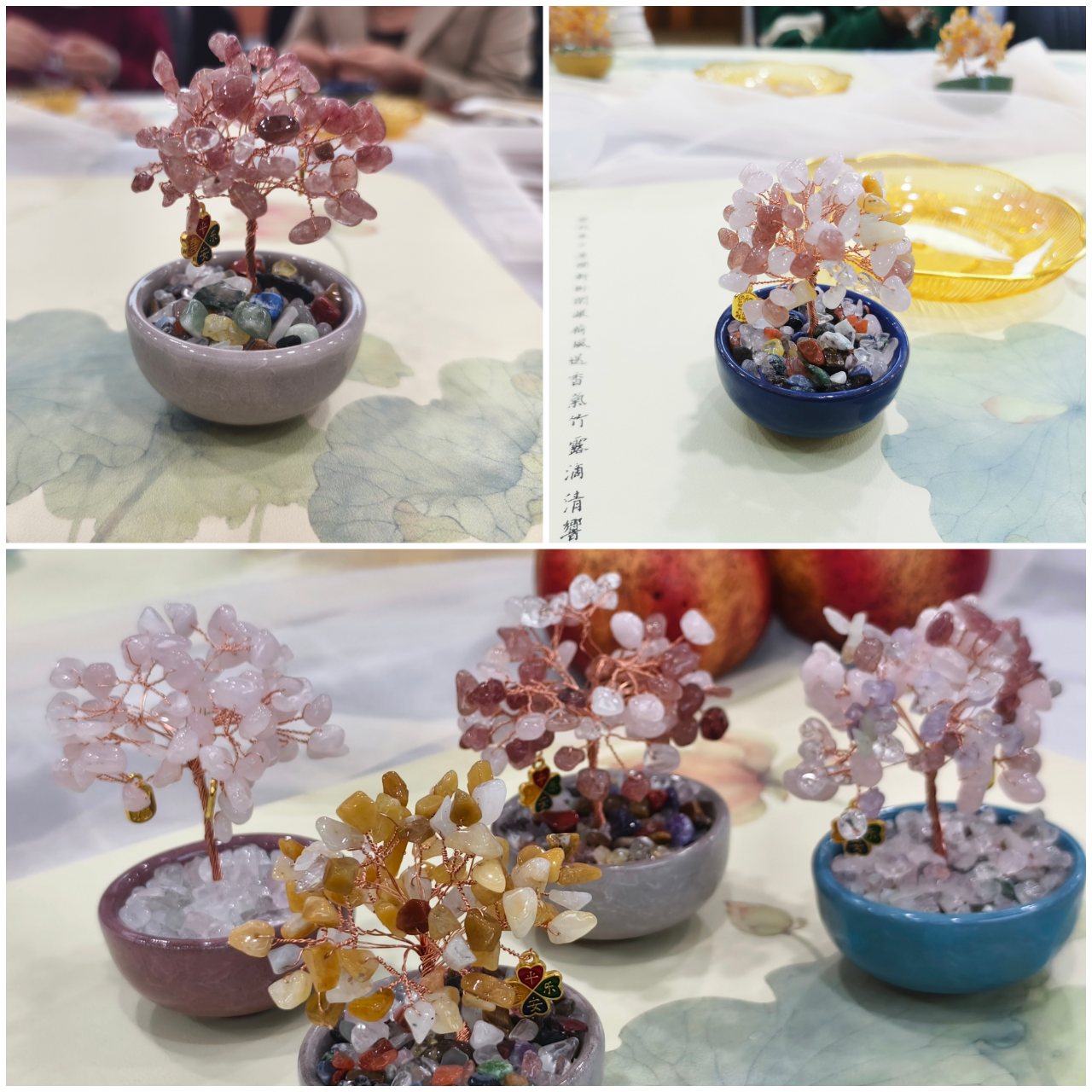 在制作环节,参与者们纷纷化身为“手工艺人”,在老师的悉心指导下,自由选择水晶碎石、金属丝等材料,学习绕线、固定与造型技巧。从最初的生疏到后来的熟练,大家一步步将手中的材料变成了一株株独具个人风格的水晶树摆件。