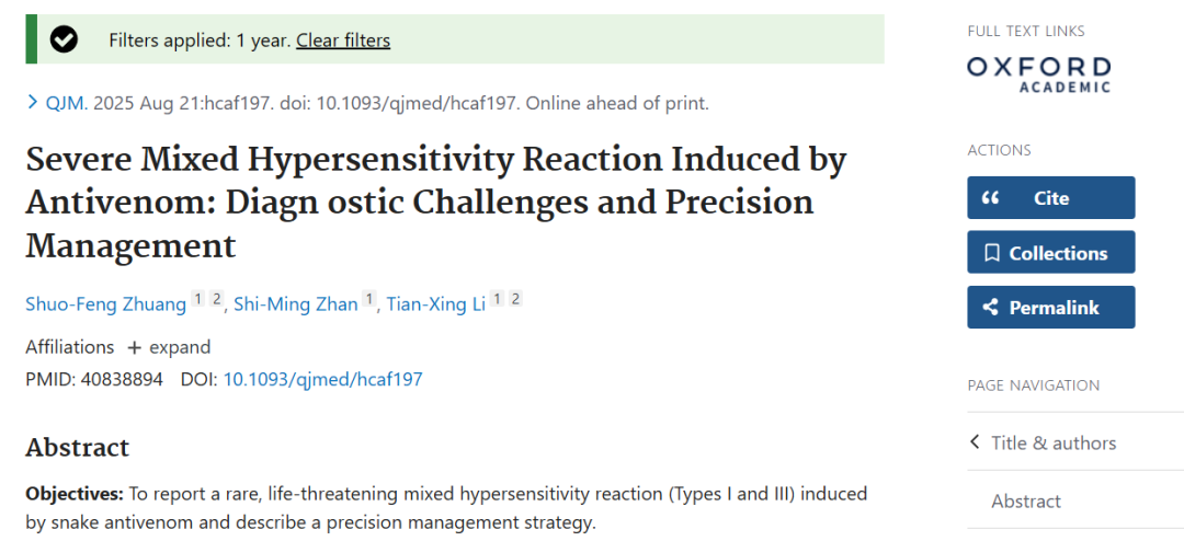 近日,我院急诊科在读硕士研究生、住院医师庄烁峰在英国牛津大学出版的《An International Journal of Medicine》杂志,以第一作者身份发表SCI论文1篇,该论文由急诊科主任医师李天星指导,题目为《Severe Mixed Hypersensitivity Reaction Induced by Antivenom: Diagn ostic Challenges and Precision Management)》。