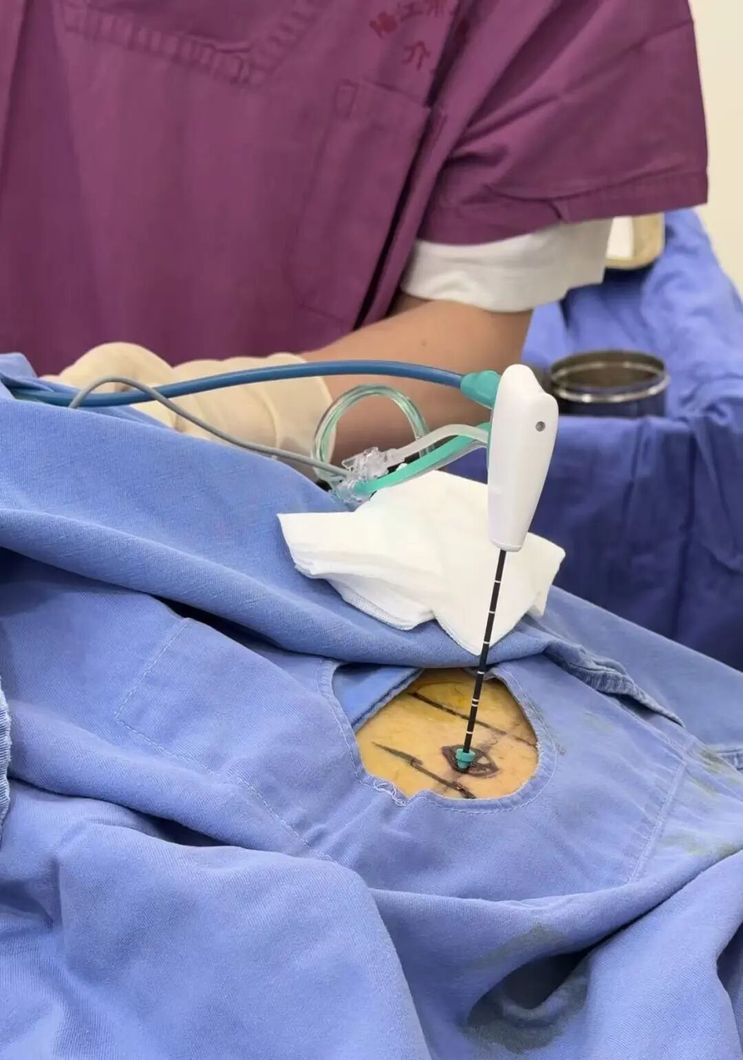 面对患者及家属对创伤小、恢复快治疗方案的迫切需求,黄书立与核医学科关则雄主任团队联合,利用PET-CT进行精准定位,将微波消融针精准刺入肿瘤中心,运用“移动消融”技术,将肿瘤组织“煮熟”,彻底灭活癌细胞。手术仅通过一个针眼大小的切口完成,对周围正常组织损伤极小,成功规避了开胸手术的巨大创伤,显著降低了麻醉及术后并发症风险。