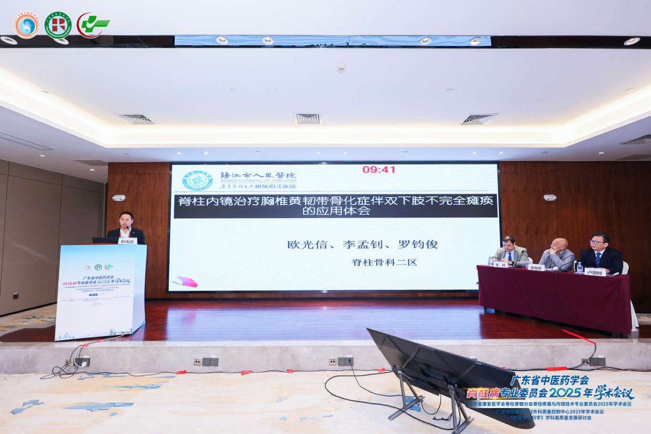 近日,广东省康复医学会脊柱内镜专委会、广东省中医药学会脊柱病专委会2025年学术会议在广州珠江宾馆召开,会议邀请了省内外各大医院脊柱外科领域的精英专家,共同探讨脊柱微创的前沿理念、技术创新,手术经验体会等重要议题。我院脊柱骨科二区主任欧光信团队受邀出席并作专题报告,分享了我院脊柱骨科在脊柱微创领域的突破性进展及经验分享,获得了与会专家的一致赞誉。