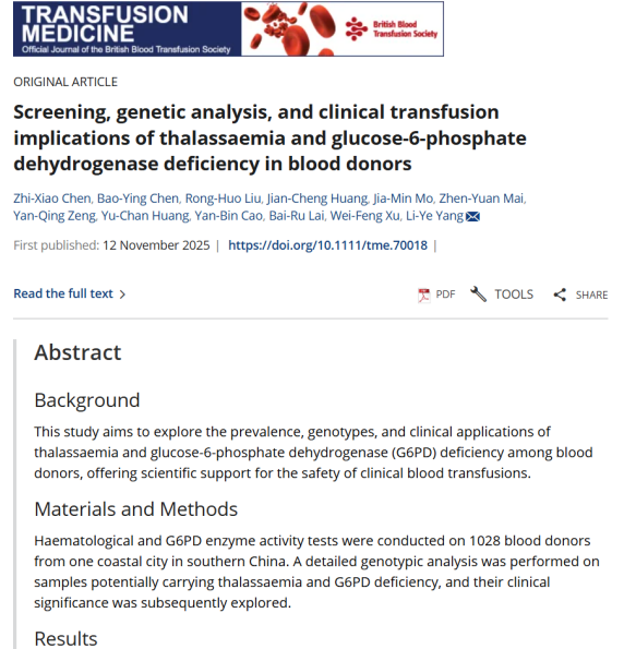 输血安全新视角:聚焦献血者遗传疾病,我院输血科成功在《Transfusion Medicine》发表论文