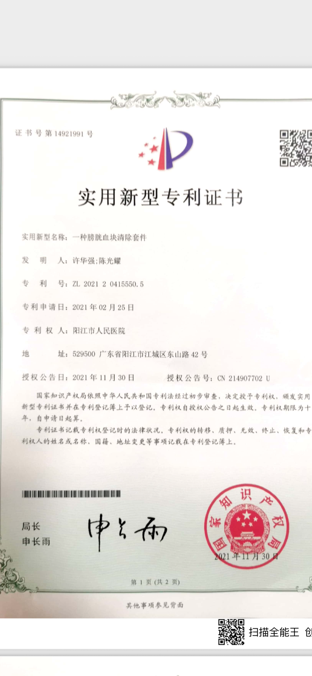 据了解,膀胱血块多由前列腺增生、膀胱肿瘤、泌尿系结石及感染等引发,若清除不及时易导致急性尿潴留、膀胱填塞等严重并发症。传统导管冲洗对大血块效果有限,手术清除则设备要求高、患者创伤大,难以满足基层诊疗需求。阳江市人民医院泌尿外一科自主研发的膀胱血块清除套件(专利号:ZL 2021 20415550.5),通过特殊设计的器械与优化流程,实现了微创高效清除,无需冲洗即可避免膀胱穿孔风险,且设备价格亲民、易学易用,完美适配基层医疗条件。