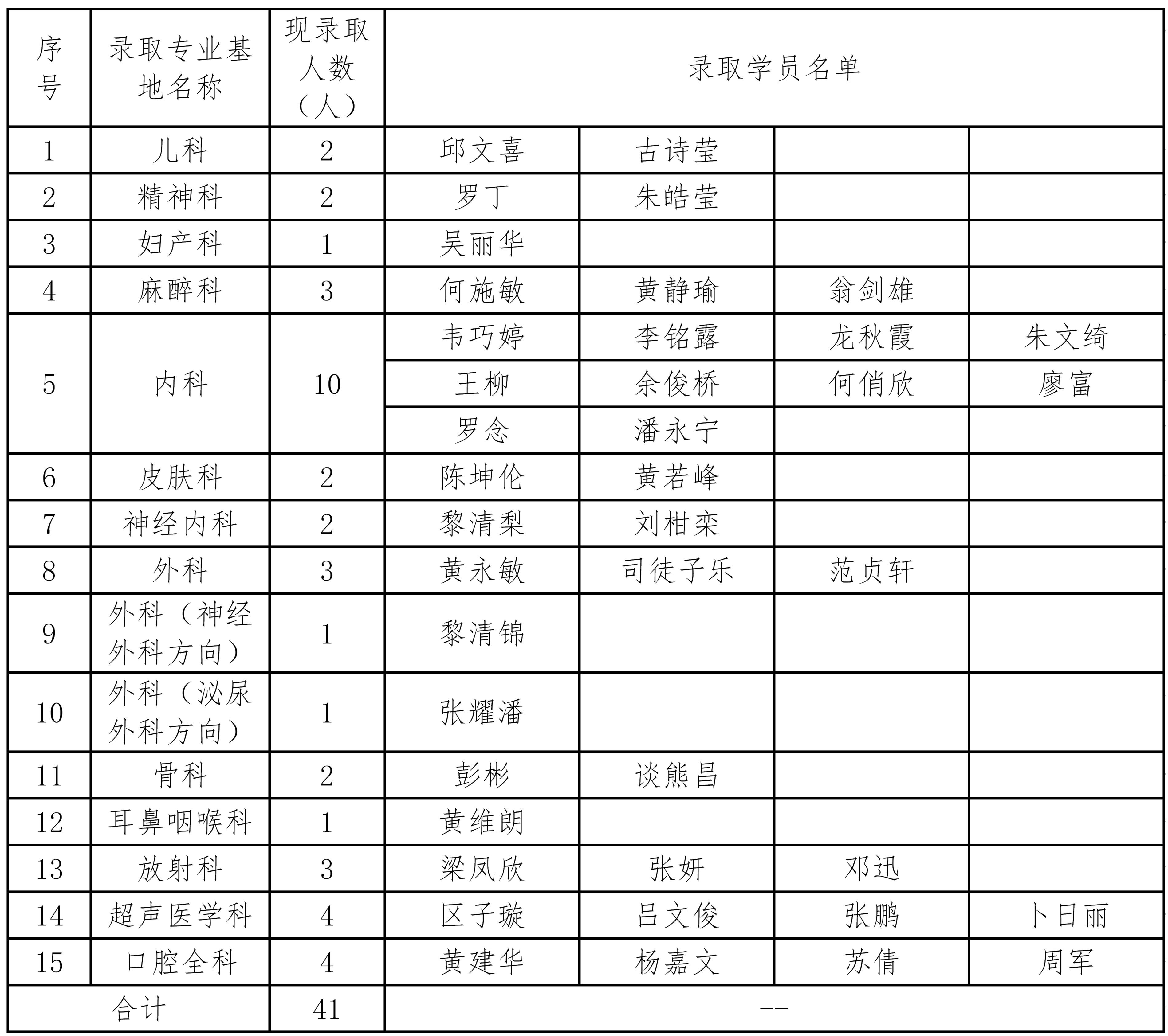 现已完成2026年第一批住院医师规范化培训学员的招收考核录取工作,录取结果公布如下表: